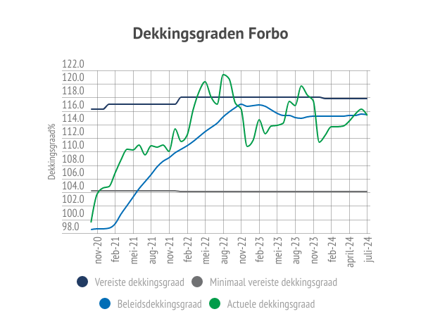 - De actuele dekkingsgraad. Dat is de stand van zaken op de laatste dag van de maand. Deze daalde in juli van 116,3% naar 115,4%.