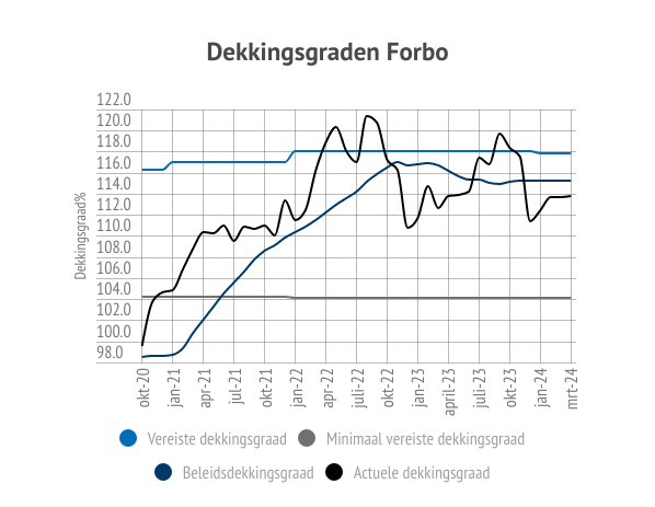 In maart daalde de rente. Dat is minder goed nieuws voor onze dekkingsgraad. Als de rente daalt, hebben we namelijk meer geld in kas nodig om in de toekomst alle pensioenen te kunnen betalen. De verplichtingen van Forbo nemen daardoor toe.